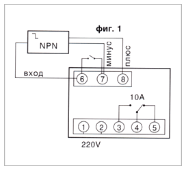 Захранване: 220V АС 50Нz клеми 1 и 2 Релейни изходи: 3,4,5 като на схема 1. Бутон клеми 6 и 7 Индуктивен датчик NPN клеми 6 вход, 7 минус, 8 плюс Степен на защита IР 40. Обхват на броене 1 ....9999 импулса, с делител по 255. |