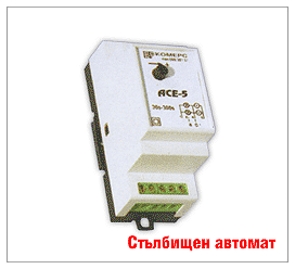 Предназначение: Стълбищният автомат е предназначен да включва и да изключва електрическата верига на стълбищното осветление. Технически данни: 1. Захранващо напрежение: 220V АС 2. Мрежова честота - 40...60Нz 3. Област на настройка - от 30 до З00s 4. Комутационна възможност при активен товар - 8А; 220\/, при електрически крушки - 800W 5. Монтаж - еврошина, габаритни размери /mm/ - 86/58/35 |